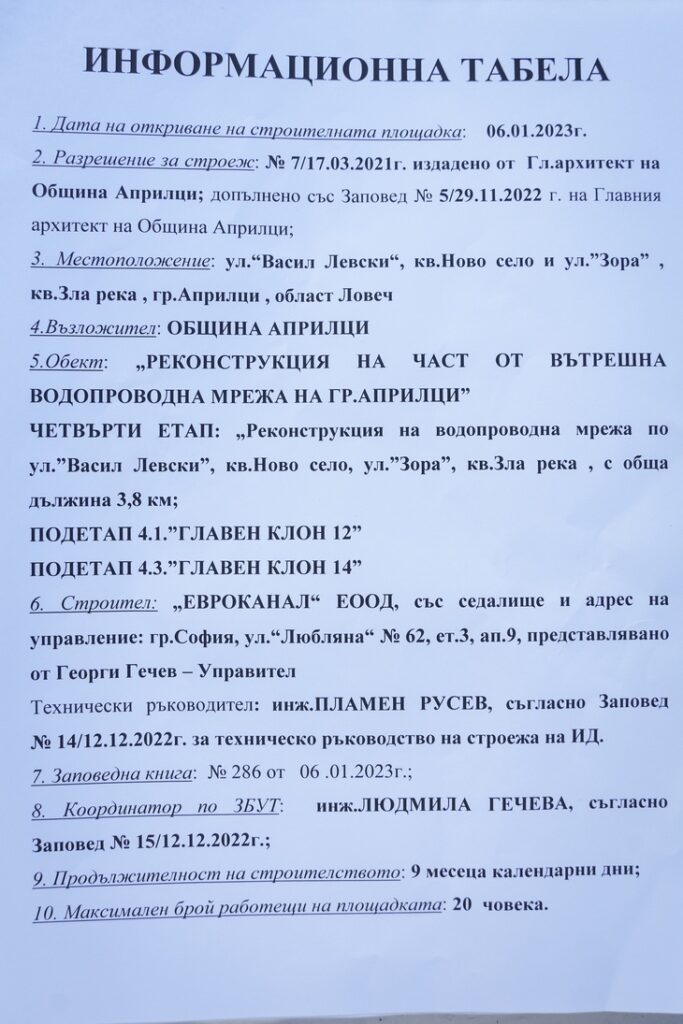 С водосвет и символична първа копка стартираха Строително-монтажните работи по проект“ Реконструкция на част от водопроводната мрежа на град Априлци“ – Етап 4. Продължителността на строителството е 9 месеца, като реконструкцията обхваща водопроводна мрежа с обща дължина от 3,8 километра.